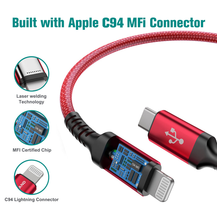 - Apple C94 MFi Certified USB-C to Lightning braided cable - Built with genuine C94 Lightning connector from Apple with reinforced strain relief and Aluminum housings.