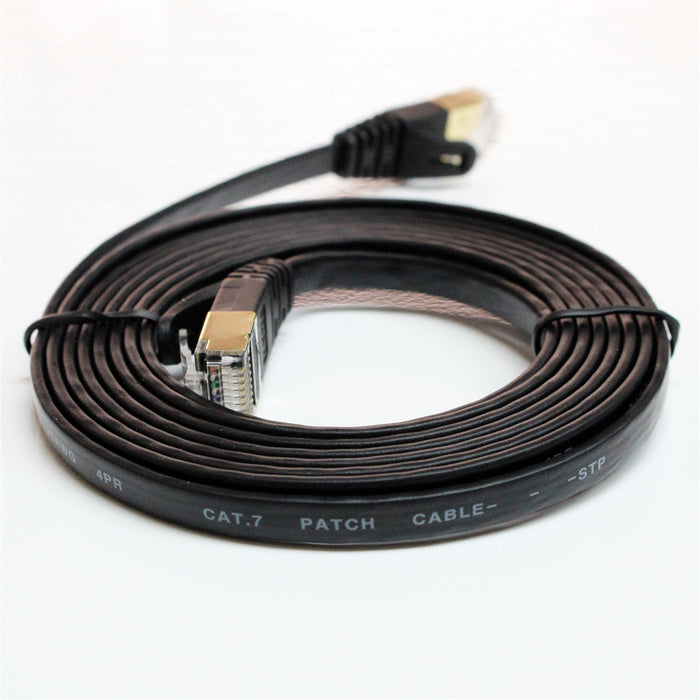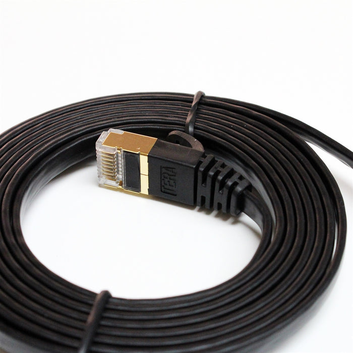 CAT-7 10 Gigabit Ultra Flat Ethernet cable, slim and flexible, easy to fit into the tightest spaces Made of 100% bare copper wire and 50 micron gold plated RJ45 connectors Perfect for network adapters, hubs, routers, DSL/cable modems, PS3, PS4, X-box, patch panels and other high performance networking applications Achieves higher performance than preceding CAT-5e and CAT6 cables - Supports: 10GBASE-T; 1000 BASE-T; 100 BASE-T; 10 BASE-T Backwards compatible with traditional CAT-5e and CAT-6 Ethernet cables and networks