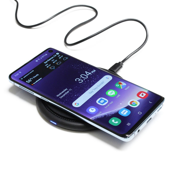 Charges wirelessly through Polycarbonate (PC) or Thermoplastic Polyurethane (TPU) up to 0.12 inch (3 mm). LED is blue when charging a Samsung Phone and will change to green when fully charged. LED is blue when charging an iPhone and will stay blue when fully charged.