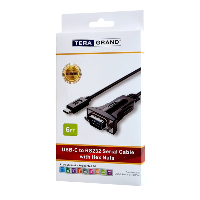 Premium USB 2.0 USB-C to RS232 Serial DB9 Adapter Cable - Supports Windows 11, 10, 8, 7, Vista, XP, 2000, 98, Linux and Mac OS - Built with FTDI Chipset and Hex Nuts, 6 Ft.